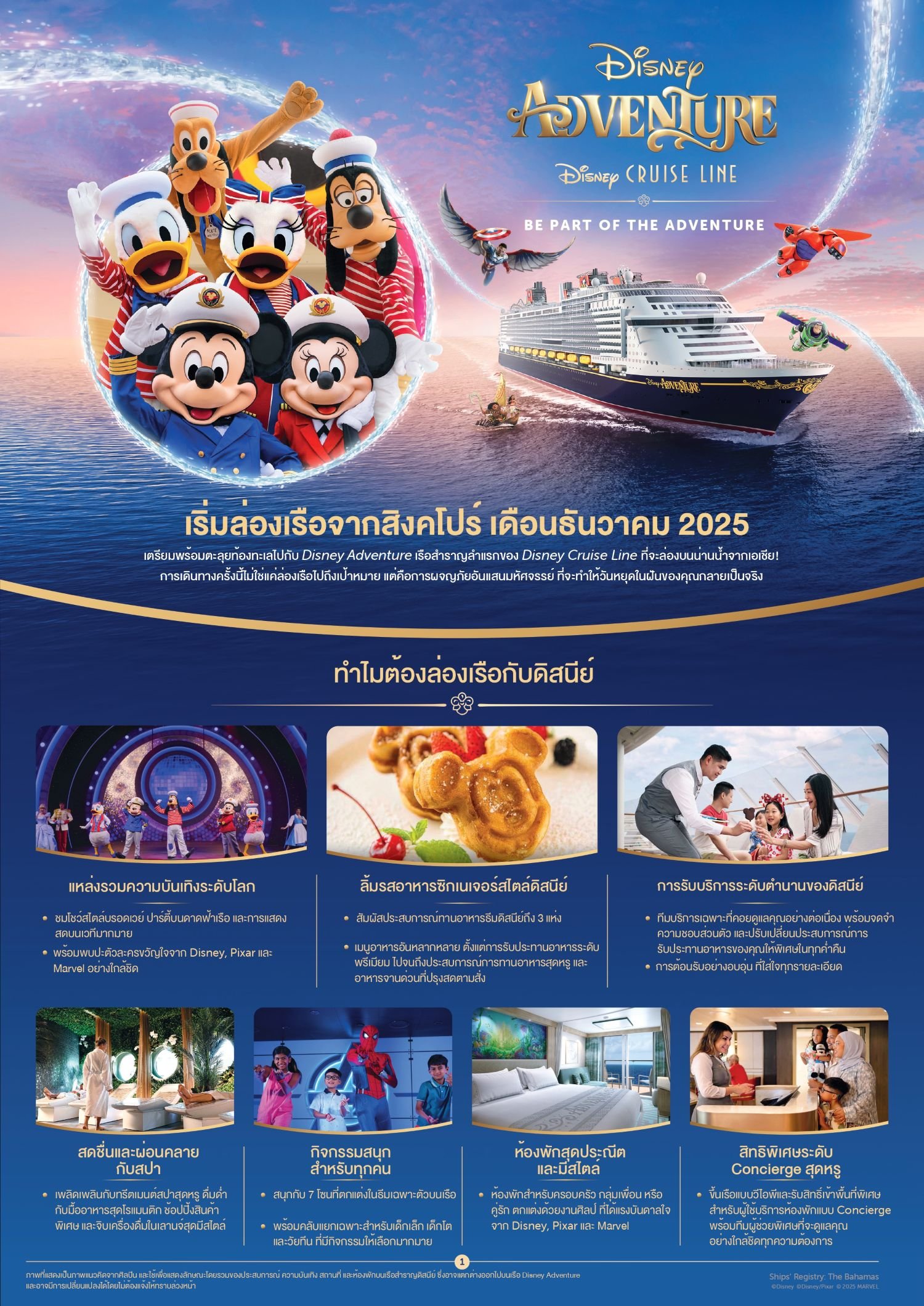 หากคุณกำลังมองหาประสบการณ์ท่องเที่ยวที่ผสมผสานระหว่างความหรูหรา ความสนุกสนาน และโลกแห่งจินตนาการจากดิสนีย์ "Disney Adventure Cruise" คือคำตอบที่ใช่ที่สุดในปี 2025 นี้! เรือสำราญลำใหม่ล่าสุดจาก Disney Cruise Line กำลังจะเปิดให้บริการครั้งแรกในเอเชีย ณ ท่าเรือ Marina Bay Cruise Centre ประเทศสิงคโปร์ ในวันที่ 15 ธันวาคม 2025 โดยเรือลำนี้มีขนาดใหญ่ถึง 208,000 GT รองรับผู้โดยสารได้มากกว่า 6,000+ คน และเป็นเรือลำแรกของดิสนีย์ที่ประจำการในภูมิภาคเอเชียตะวันออกเฉียงใต้