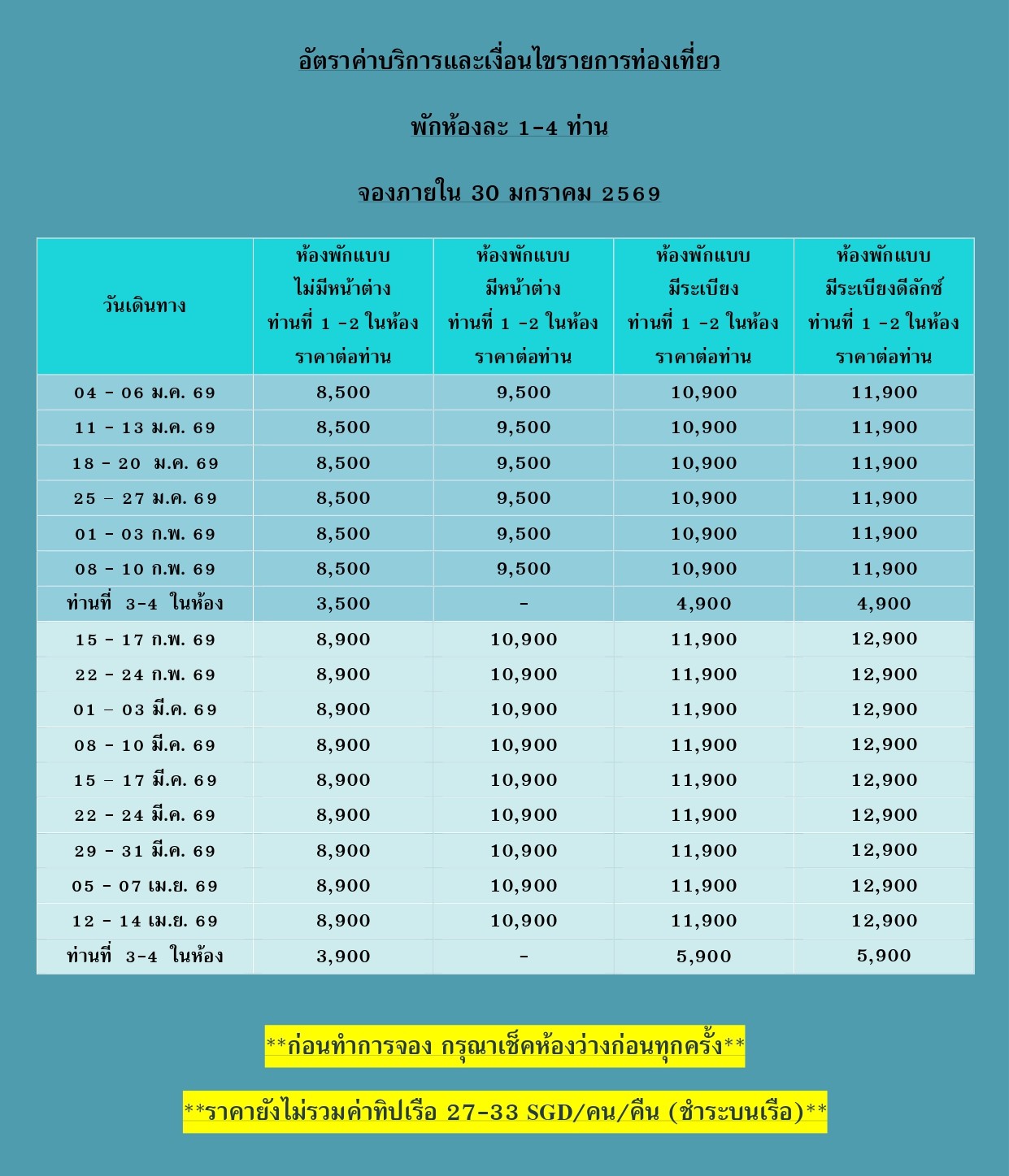 - Gratuity / Service Charge ทิปส์ พนักงานบนเรือ ตามระบบสากล ทางเรือจะเรียกเก็บเข้า Cruise Card บัตรประจำตัวบนเรือของท่าน ตามประเภทห้องพัก รายละเอียดดังนี้ INSIDE / OCEANVIEW 27 SGD /BALCONY 33 SGD ต่อท่านต่อคืน