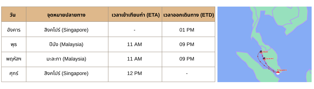 *Ship arrives Penang on Thursday at 11am and departs at 6pm.^ Ship departs Singapore on Tuesday at 11.59pm.