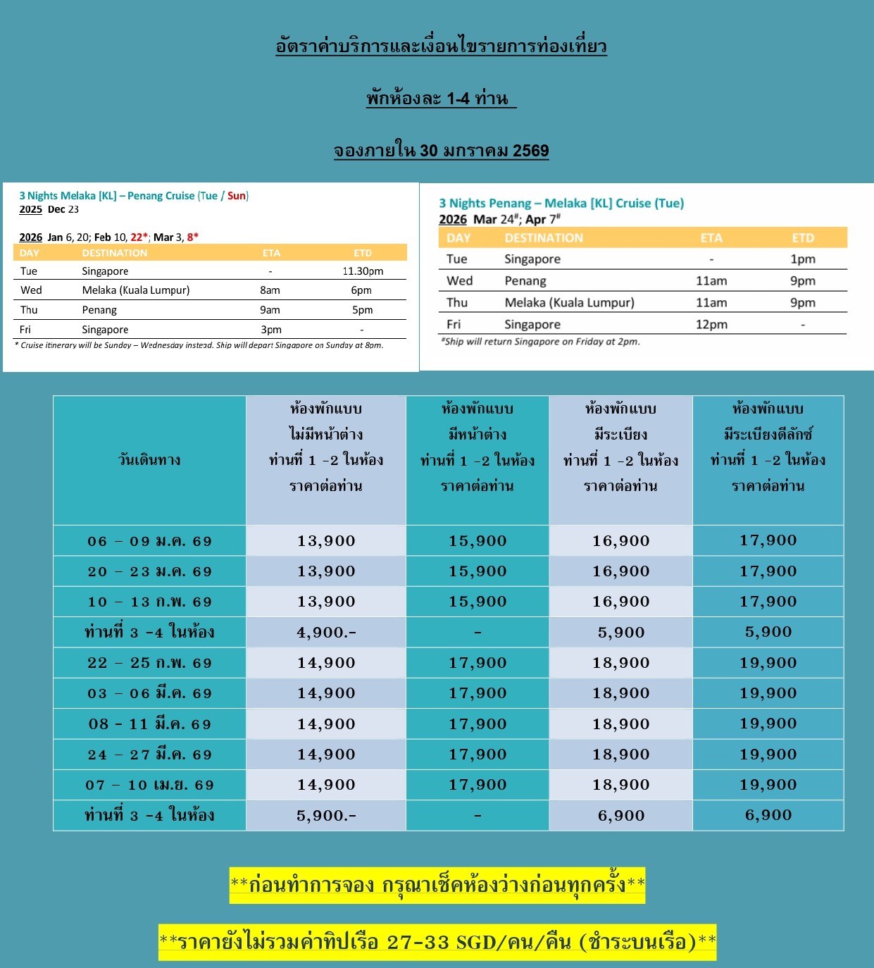 - Gratuity / Service Charge ทิปส์ พนักงานบนเรือ ตามระบบสากล ทางเรือจะเรียกเก็บเข้า Cruise Card บัตรประจำตัวบนเรือของท่าน ตามประเภทห้องพัก รายละเอียดดังนี้ INSIDE / OCEANVIEW 27 SGD /BALCONY 33 SGD ต่อท่านต่อคืน