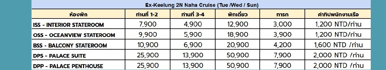 - Gratuity / Service Charge ทิปส์ พนักงานบนเรือ ตามระบบสากล ทางเรือจะเรียกเก็บเข้า Cruise Card บัตรประจำตัวบนเรือของท่าน ตามประเภทห้องพัก รายละเอียดดังนี้