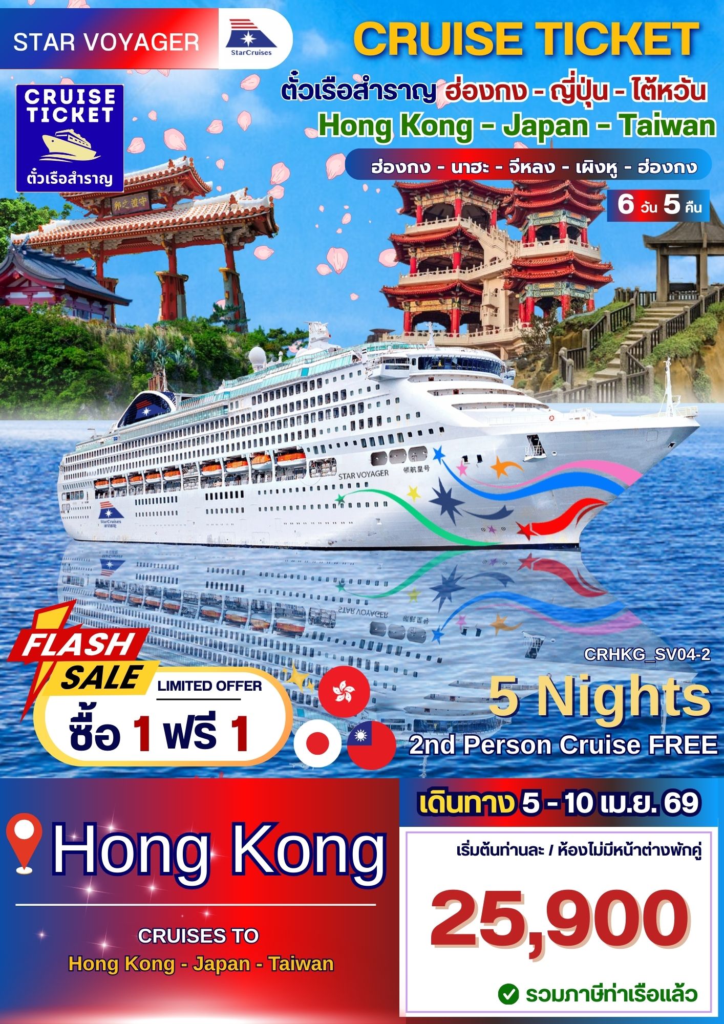 ล่องเรือสำราญ ฮ่องกง-ญี่ปุ่น-ไต้หวัน พักบนเรือ 5 คืน