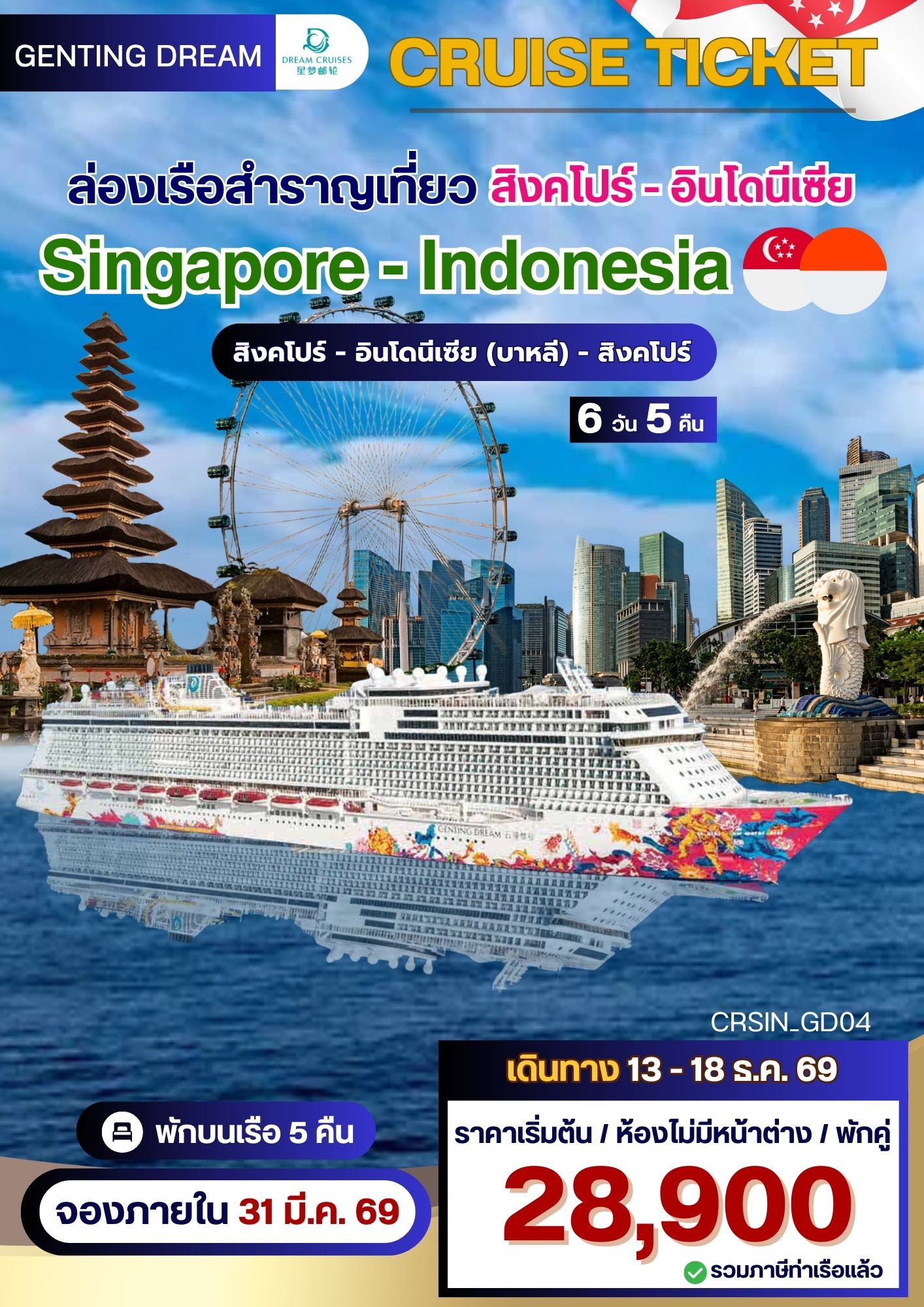เปิดประสบการณ์ใหม่…พักผ่อนสบายๆ 5 คืนสุดพิเศษกับเรือสำราญ Genting Dream ออกเดินทางจากสิงคโปร์ ล่องข้ามทะเลสู่ประเทศอินโดนีเซีย เที่ยวบาหลีเหนือ และ ใต้ พร้อมทำกิจกรรม ความบันเทิงต่างๆ บนเรือมากมาย