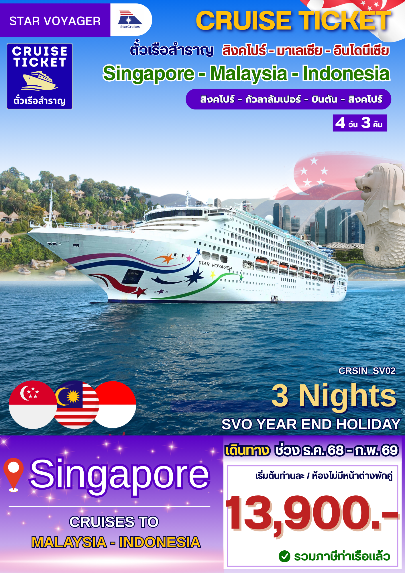 ล่องเรือสำราญ สิงคโปร์-มาเลเซีย-อินโดนีเซีย พักบนเรือ 3 คืน