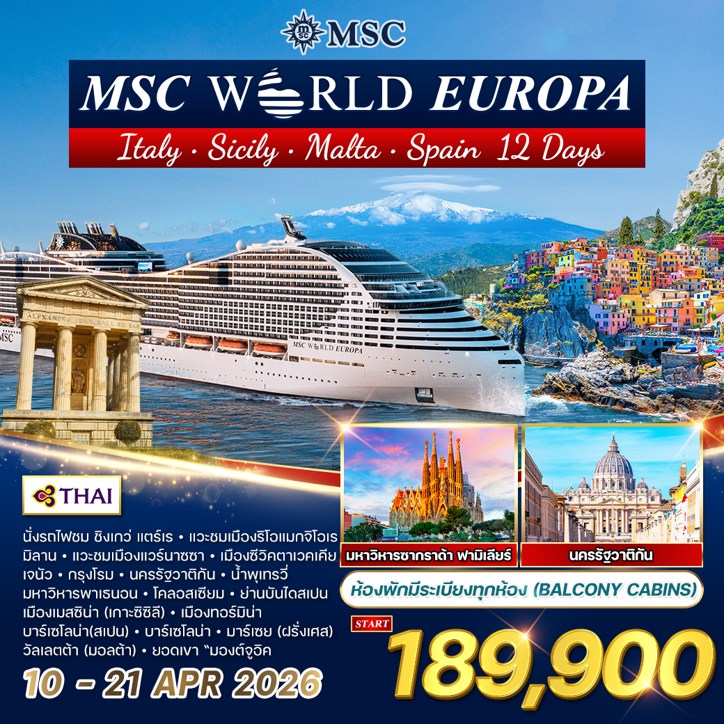 วันที่เดินทาง  10-21 เมษายน 2569 กับเรือ MSC World Europa เป็นเรือสำราญสุดหรูระดับโลก  เส้นทาง อิตาลี*ซิซิลี*มอลต้า*สเปน*ฝรั่งเศส พักบนเรือสำราญสุดหรู 6 คืน พักโรงแรม 2 คืน