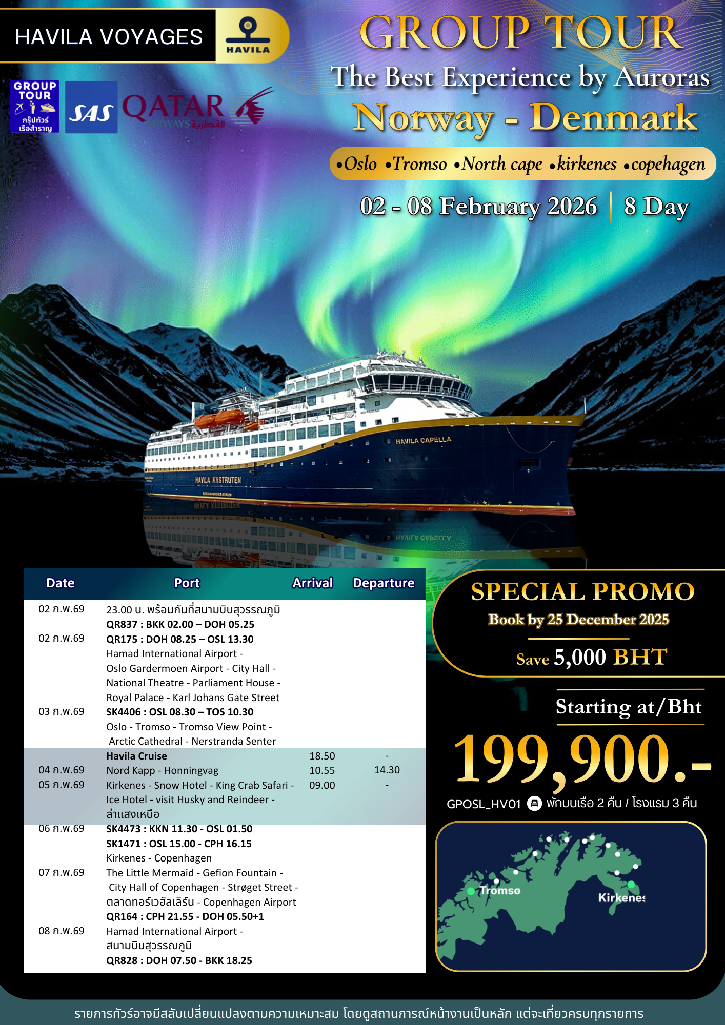 1. ตั๋วเครื่องบินไป-กลับ แบบหมู่คณะ เส้นทาง กรุงเทพ - โดฮาร์ - ฮอสโล - ทรอมโช- คิทเคอเนท - โคเปเฮเกน - โดฮาร์ - กรุงเทพ สายการบิน Qatar Airline และ Scandinavian Airline2. น้ำหนักกระเป้า 23 กิโลกรัมสำหรับ Qatar Airline และ 20 กิโลกรัม สำหรับ Scandinavian Airline3. ห้องพักบนเรือ Havila 2 คืน4. พักโรงแรม 3 คืน5. รถปรับอากาศรับ-ส่งตามเส้นทาง6. บัตรเข้าชมสถานที่ตามที่ระบุ7. รถบัสสำหรับล่าแสงเหนือ8. อาหารตามรายการตามโปรแกรม9. เจ้าหน้าที่คนไทยดูแลตลอดการเดินทาง10. ค่าประกันอุบัติเหตุในการเดินทาง 1,000,000 บาท (ขึ้นอยู่กับเงื่อนไขของกรมธรรม์เฉพาะเหตุการณ์ที่เกิดขึ้นระหว่างการเดินทางเท่านั้น โดยจะต้องใช้ใบรับรองแพทย์และใบเสร็จในการเบิก)| อัตราค่าบริการ ไม่รวมค่าใช้จ่ายดังนี้ |
