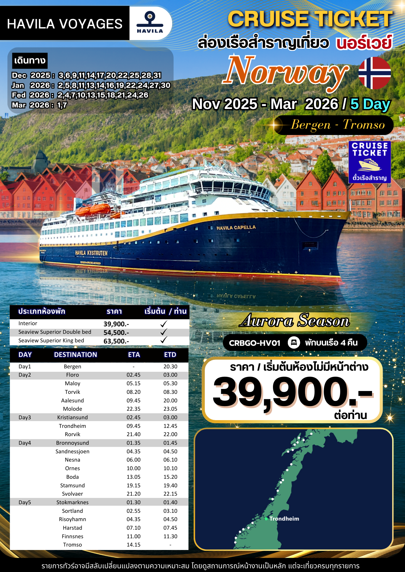 ล่องเรือสำราญ Bergen - Tromso พักบนเรือ 4 คืน เรือ HAVILA VOYAGES ลงเรือที่ Norway️️️ เส้นทาง Bergen - Tromso วันที่เดินทาง Nov 2025 - Mar 2026