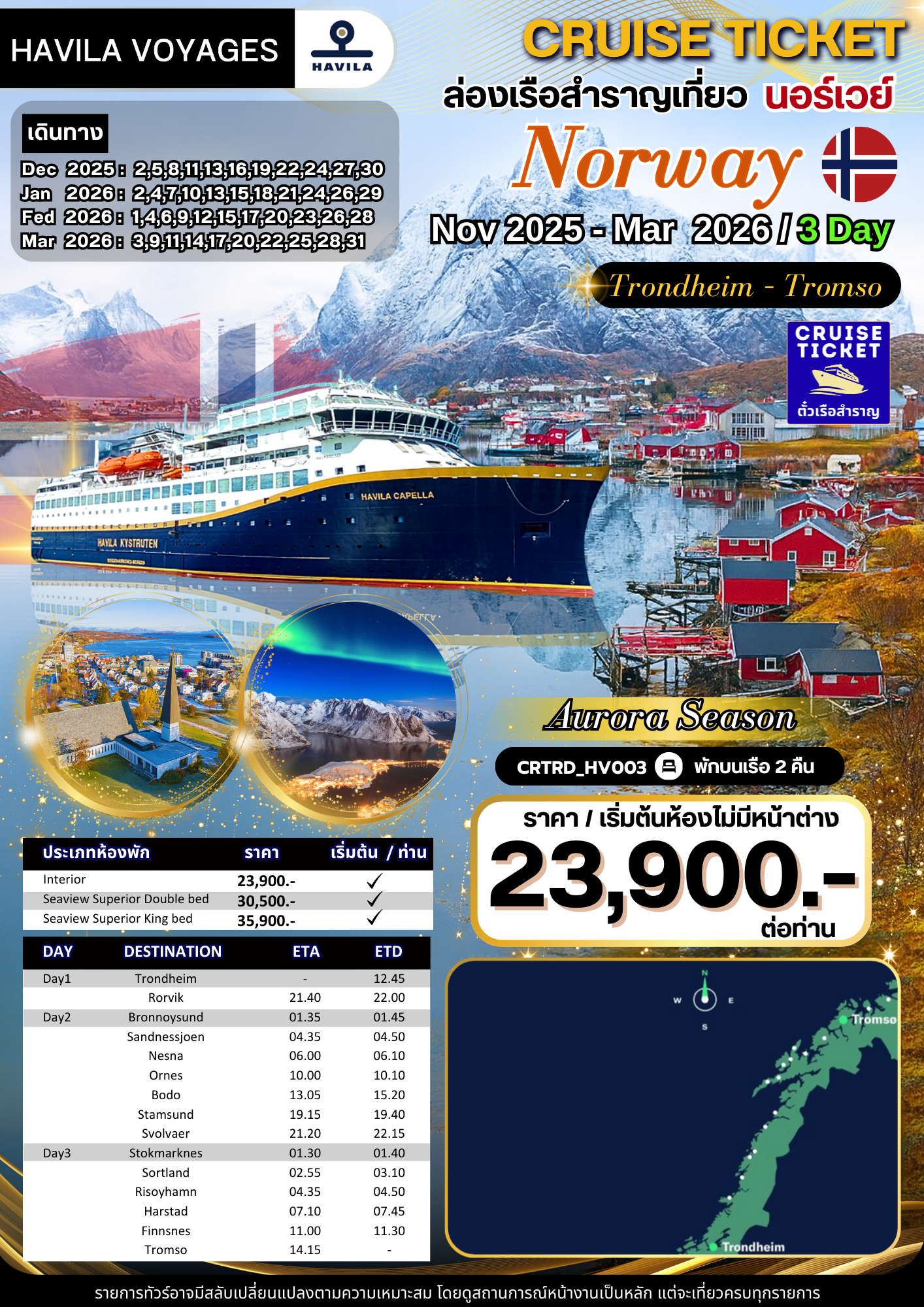 ล่องเรือสำราญ Trondheim Tromso พักบนเรือ 2 คืน เรือ HAVILA VOYAGES ลงเรือที่ Norway️️️ เส้นทาง Trondheim Tromso วันที่เดินทาง Nov 2025 - Mar 2026