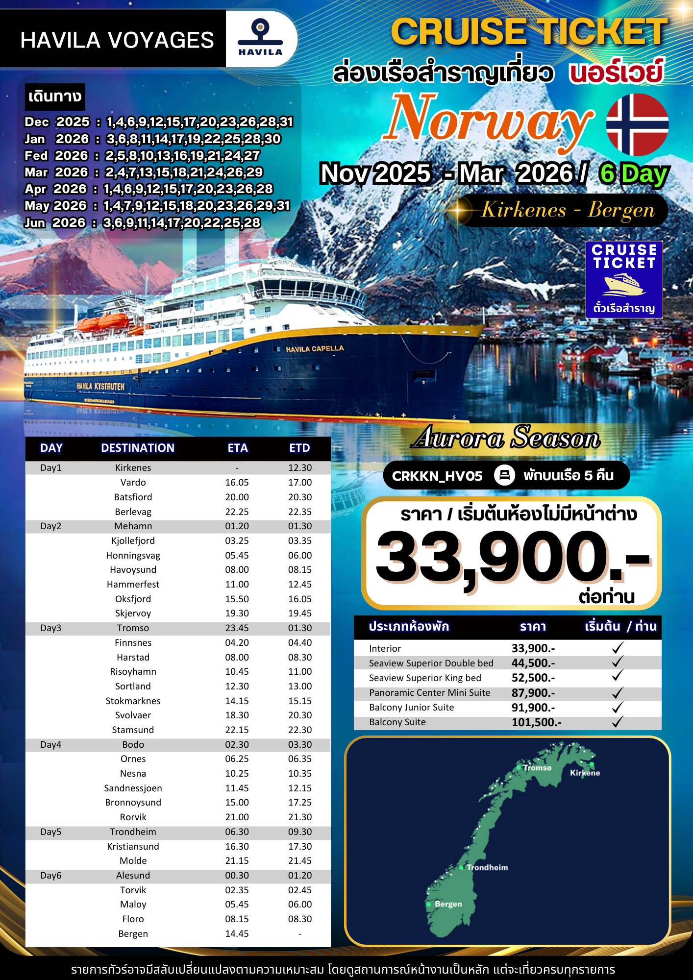 ล่องเรือสำราญ Bergen - Kirkenes พักบนเรือ 6 คืน เรือ HAVILA VOYAGES ลงเรือที่ Norway️️️ เส้นทาง Kirkenes - Bergen วันที่เดินทาง Nov 2025 - Mar 2026