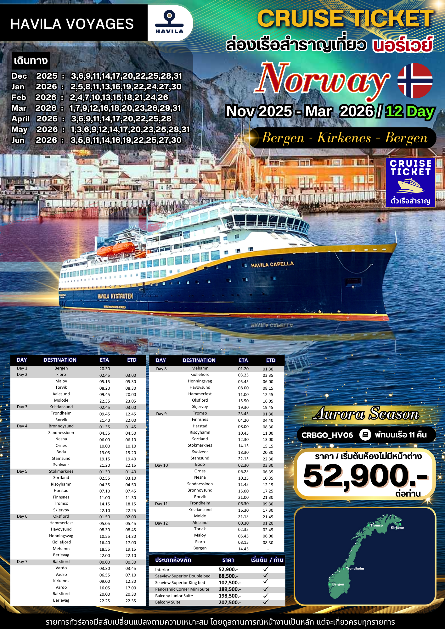 ล่องเรือสำราญ Bergen - Kirkenes - Bergen พักบนเรือ 11 คืน เรือ HAVILA VOYAGES ลงเรือที่ Norway️️️ เส้นทาง Bergen - Kirkenes - Bergen วันที่เดินทาง Nov 2025 - Mar 2026