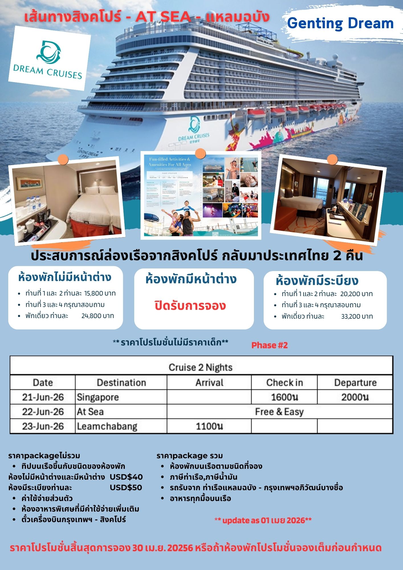 เปิดประสบการณ์ใหม่…พักผ่อนสบายๆ สุดพิเศษกับเรือสำราญ Genting Dream ออกเดินทางจากสิงคโปร์ ล่องข้ามทะเลสู่แหลมฉบัง และพร้อมทำกิจกรรม ความบันเทิงต่างๆ บนเรือมากมาย พักบนเรือ 2 คืน