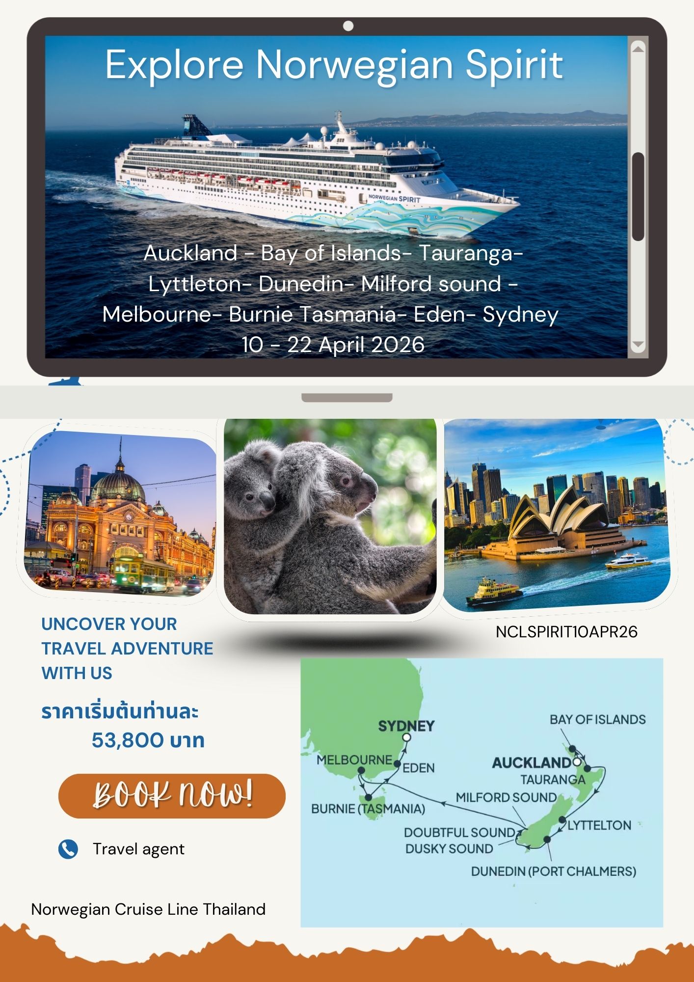 ️️️ เส้นทาง โอ๊คแลนด์ - เบย์ออฟไอส์แลนด์ - เทารังกา - ลิตเทิลตัน - ดะนีดิน - มิลฟอร์ดซาวด์ - เมลเบิร์น - เบอร์นี (รัฐแทสเมเนีย) - อีเดน - ซิดนีย์
