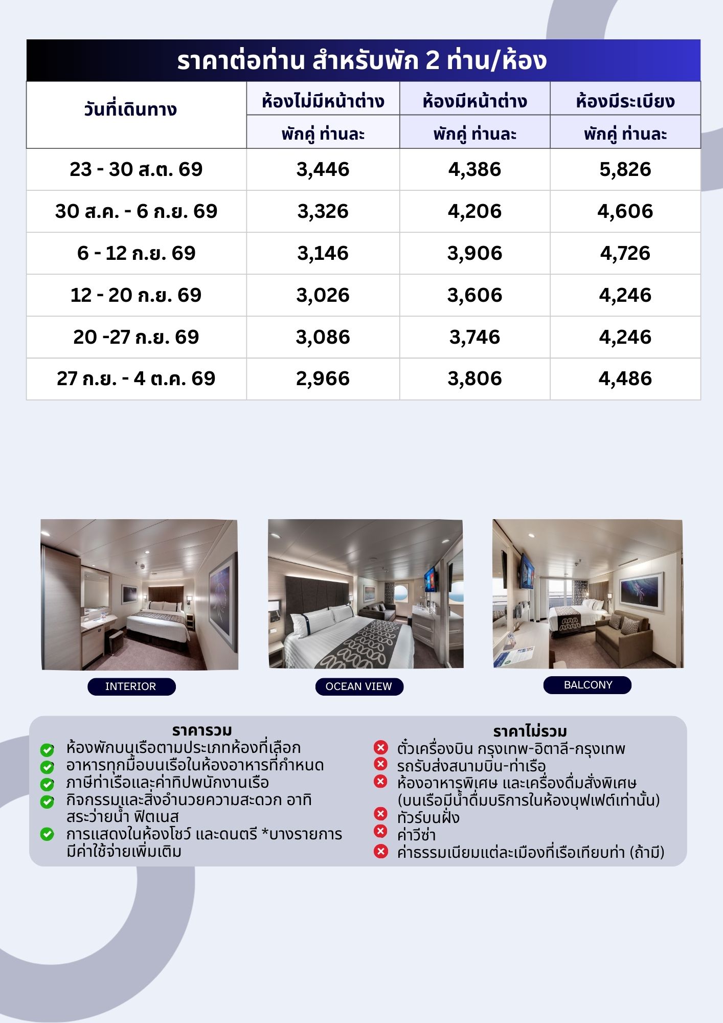 - รายการ กำหนดการ เส้นทางเรือ อาจเปลี่ยนแปลงได้ตามความเหมาะสม ขึ้นอยู่กับดุลยพินิจ Captain บนเงื่อนไขของการรักษาความปลอดภัย ตามหลักสากล