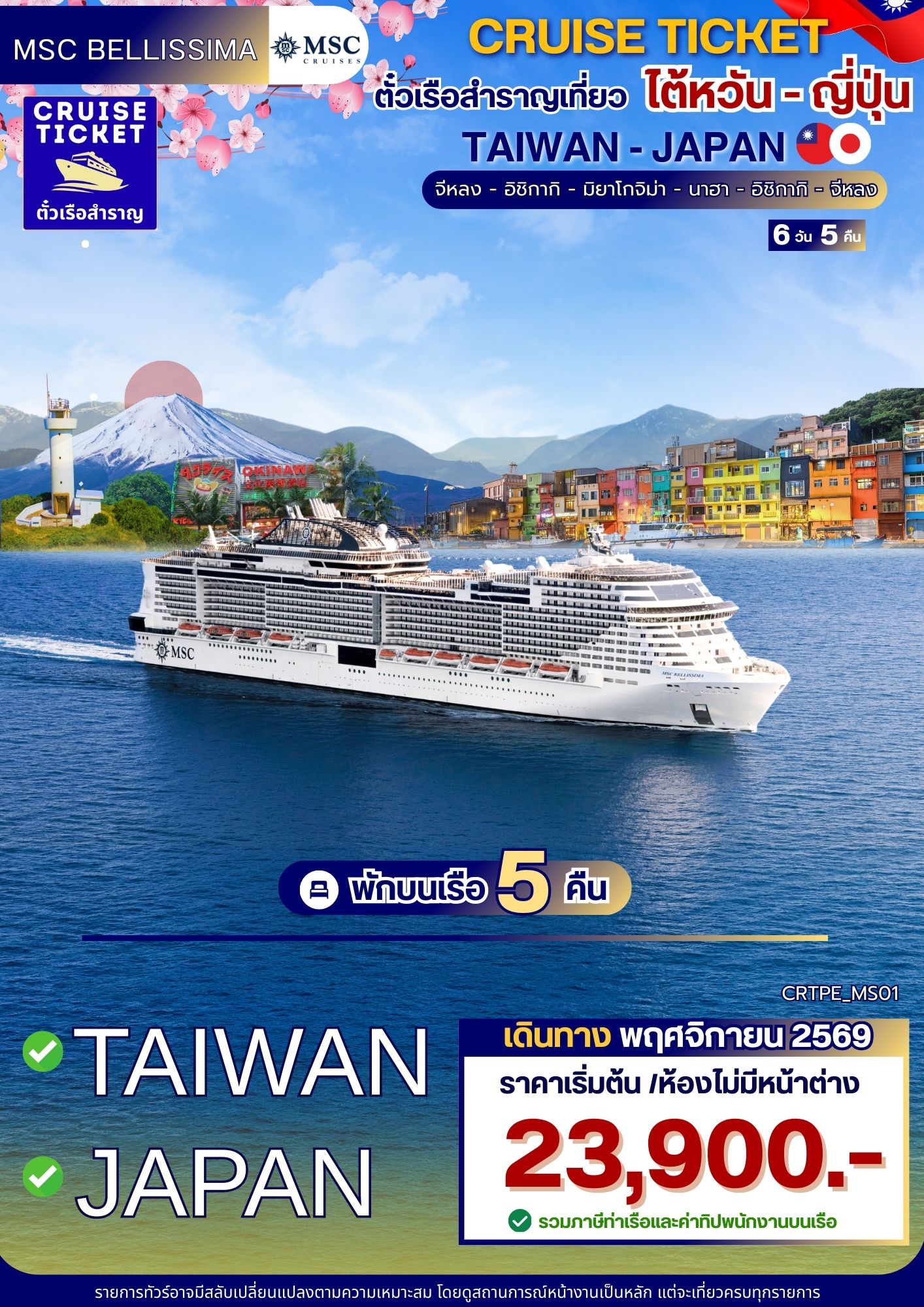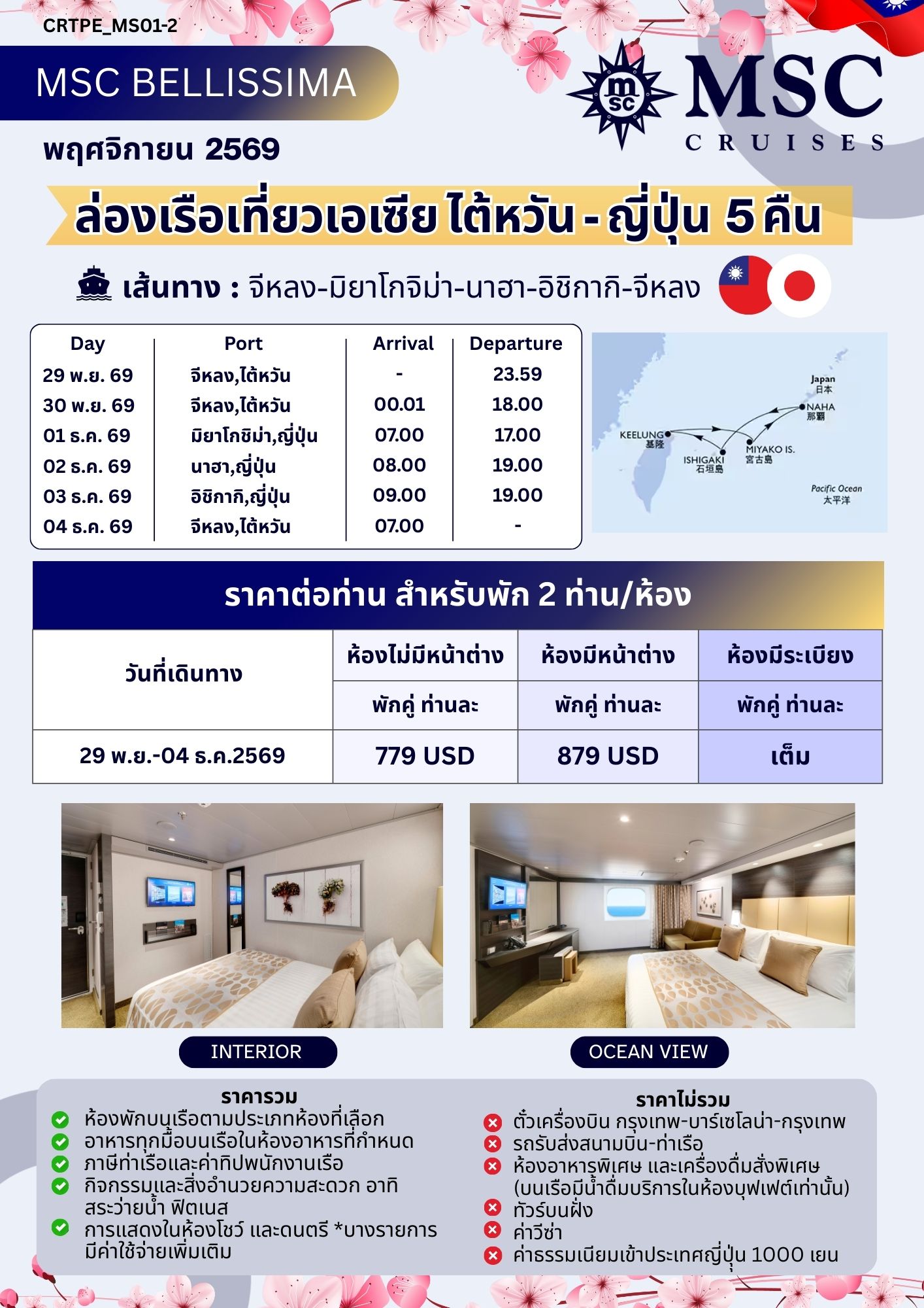 ล่องเรือสำราญ MSC Bellissima ขึ้น-ลงเรือที่ไต้หวัน ล่องสู่ญี่ปุ่น เลือกได้ 2 เส้นทาง " จีหลง-อิชิกากิ-มิยาโกจิม่า-นาฮา-อิชิกากิ-จีหลง" , จีหลง-มิยาโกจิม่า-นาฮา-อิชิกากิ-จีหลง พักบนเรือ 5 คืน **ราคานี้เป็นราคาเริ่มต้นของห้องไม่มีหน้าต่างง