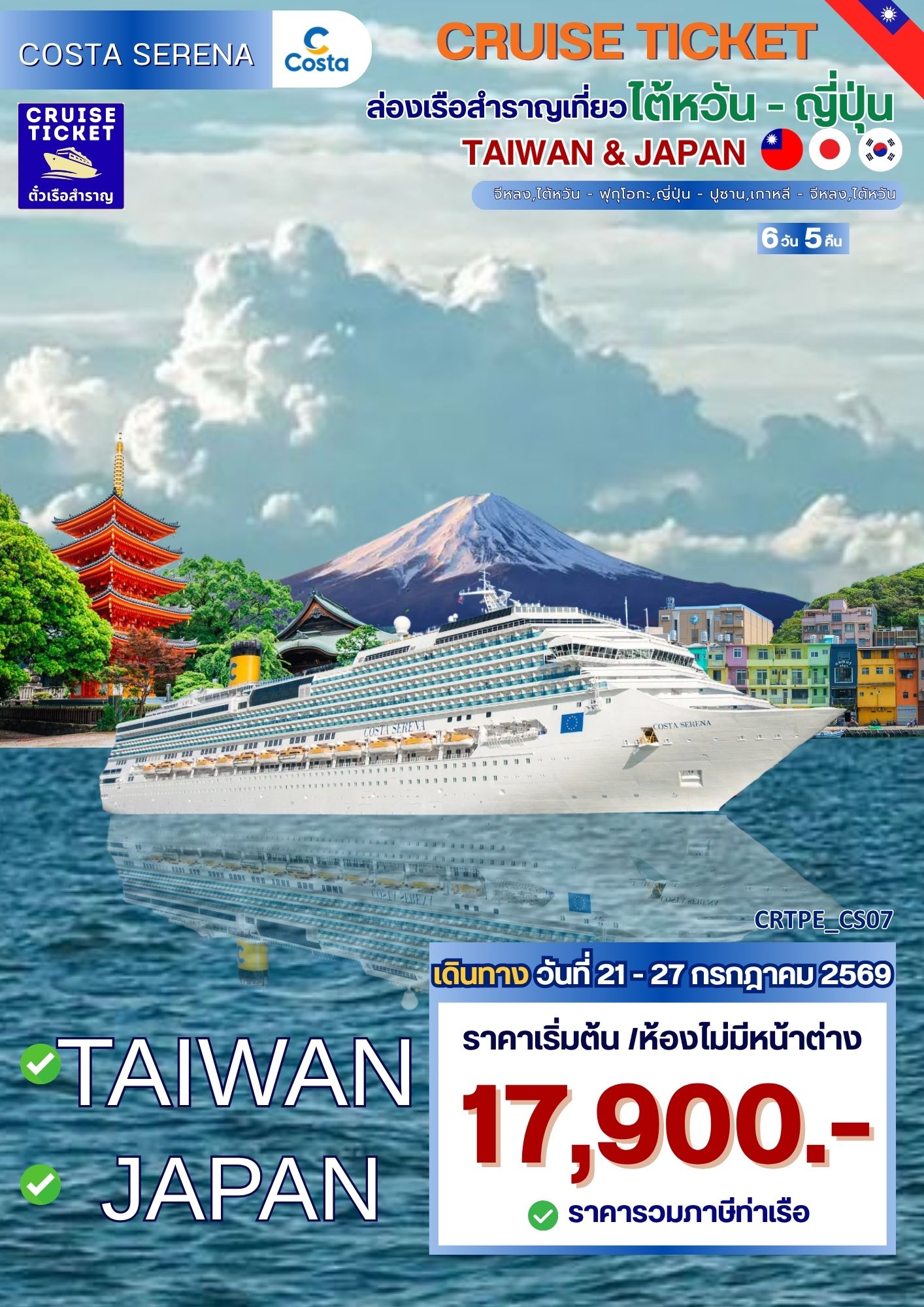 สงกรานต์ปีนี้ชวนล่องเรือ Costa Serena เส้นทาง จีหลง - ฟุกุโอกะ - ปูซาน - จีหลง พักบนเรือ 5 คืน เดินทาง 21 - 27 กรกฎาคม 2569