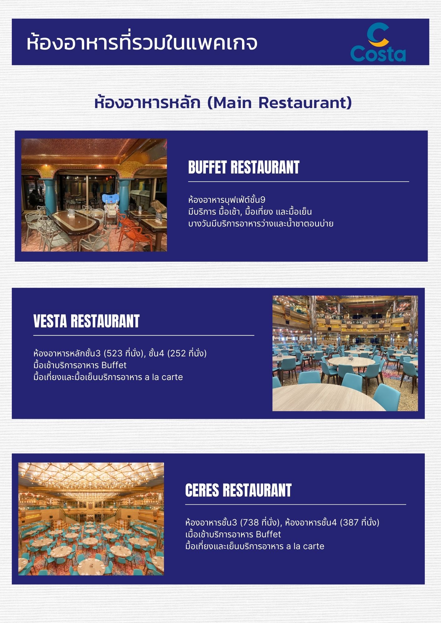 - อาหารทุกมื้อบนเรือ ในห้อง บัฟเฟ่ และ ห้องอาหารหลัก
