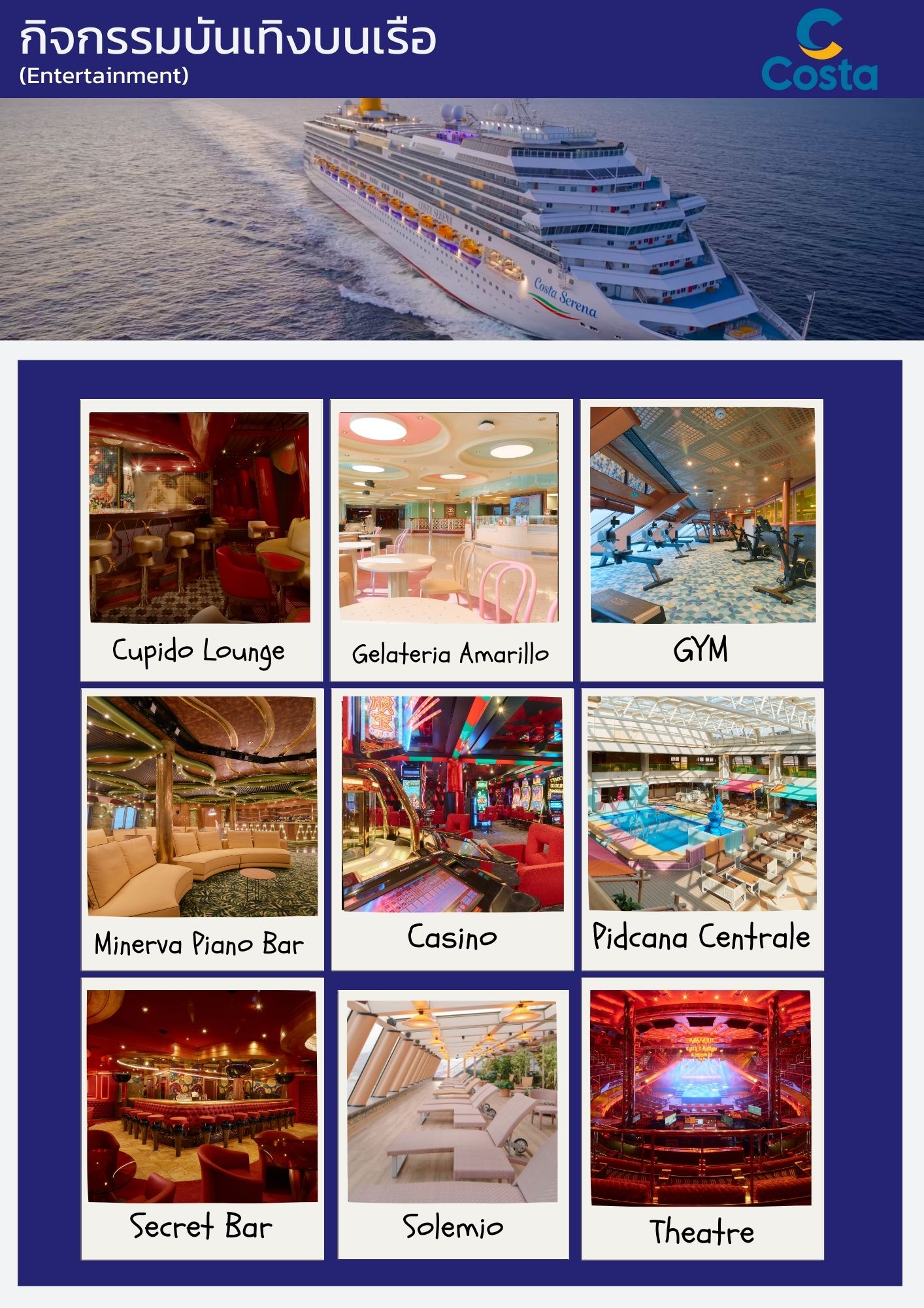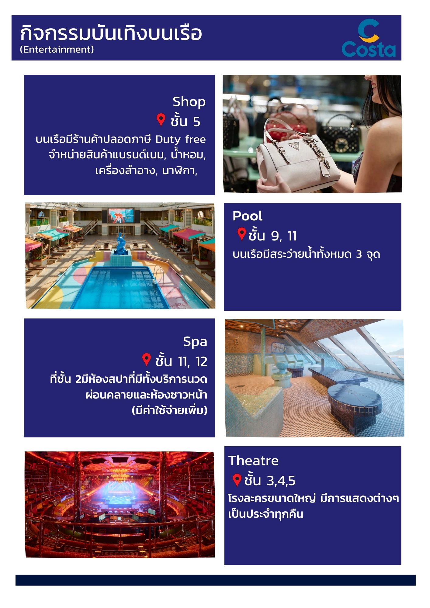 - การแสดง กิจกรรม และสิ่งอำนวยความสะดวกบนเรือ