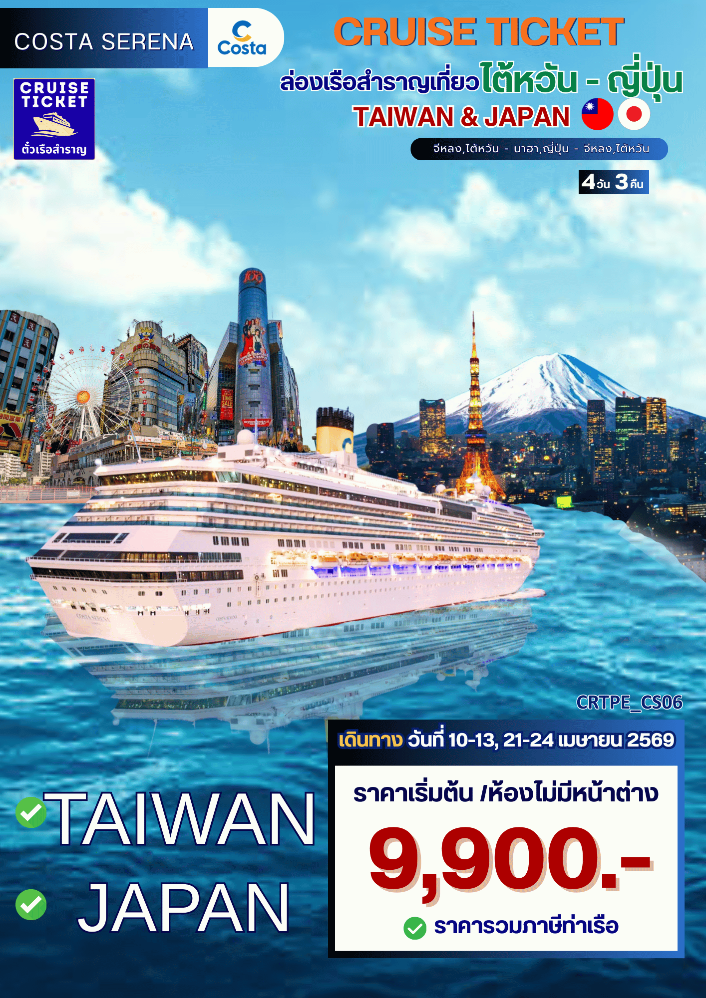 ล่องเรือสำราญ ญี่ปุ่น - ไต้หวัน พักบนเรือ 4 คืน