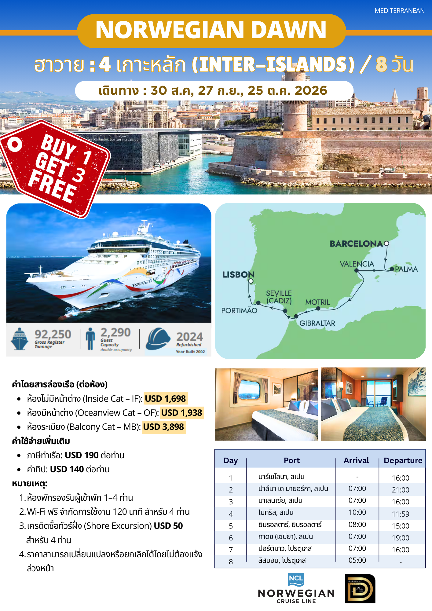 ล่องเรือสำราญเที่ยวฮาวาย : 4 เกาะหลัก (Inter-Islands) / 8 วัน เรือ Norwegian Dawn ลงเรือที่ สเปน️️️ เส้นทาง บาร์เซโลนา, สเปน-ปาล์มา เด มายอร์กา, สเปน-บาเลนเซีย, สเปน-โมทริล, สเปน-ยิบรอลตาร์, ยิบรอลตาร์-กาดิซ (เซบียา), สเปน-ปอร์ติมาว, โปรตุเกส-ลิสบอน, โปรตุเกส วันที่เดินทาง : 30 ส.ค, 27 ก.ย., 25 ต.ค. 2026 ราคา