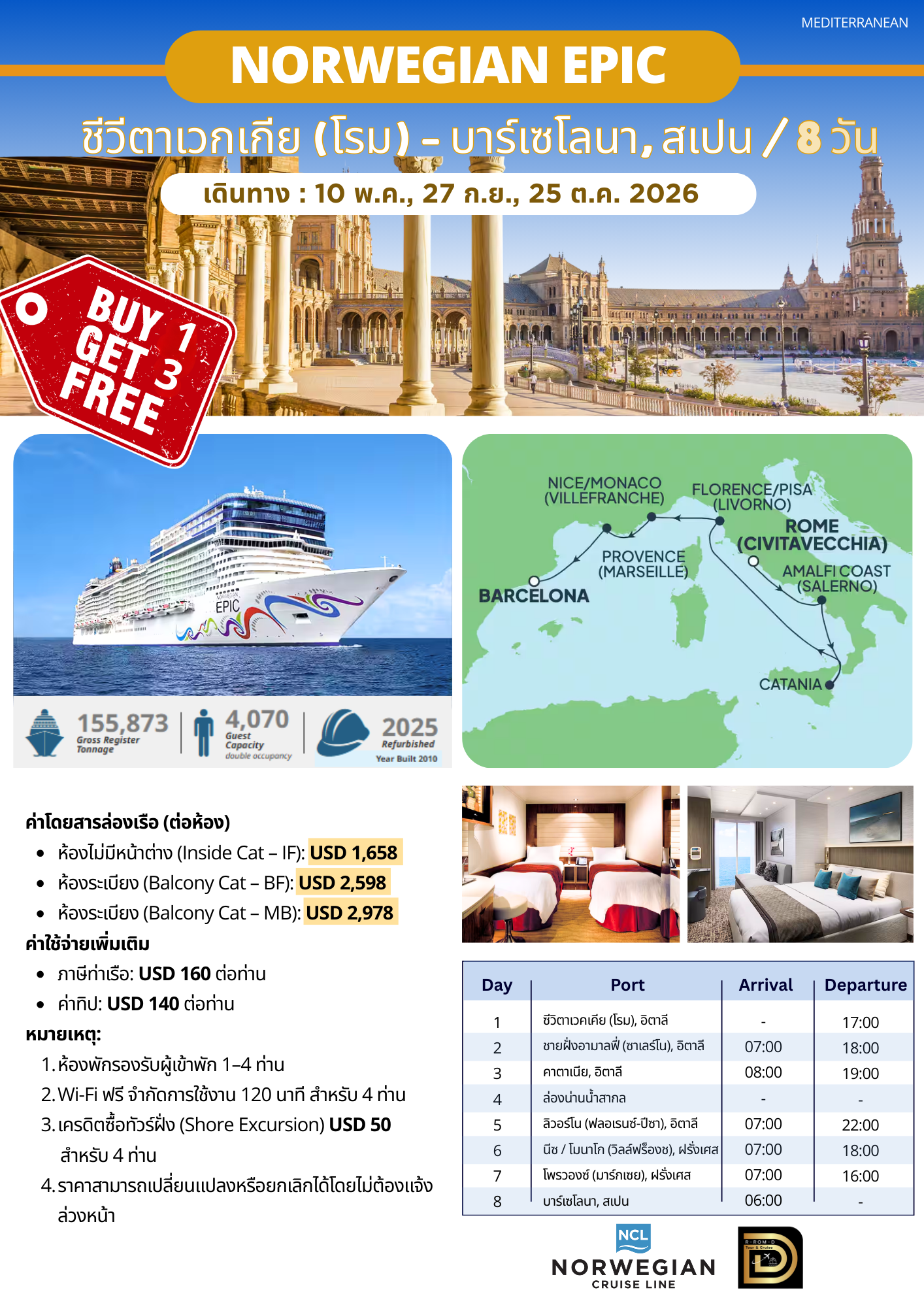 ล่องเรือสำราญเที่ยว ชีวีตาเวกเกีย (โรม) – บาร์เซโลนา, สเปน / 8 วัน เรือ Norwegian Epic ลงเรือที่ อิตาลี️️️