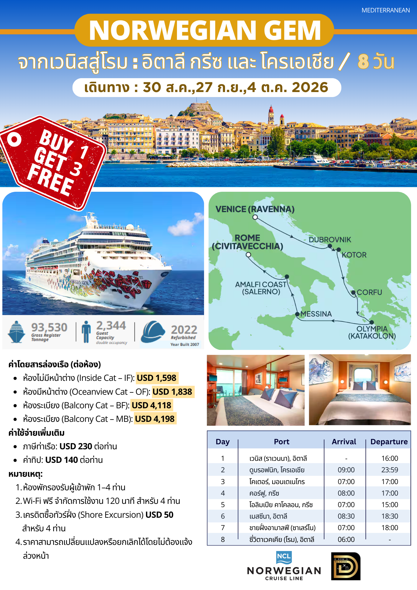 ล่องเรือสำราญจากเวนิสสู่โรม : อิตาลี กรีซ และ โครเอเชีย / 8 วัน