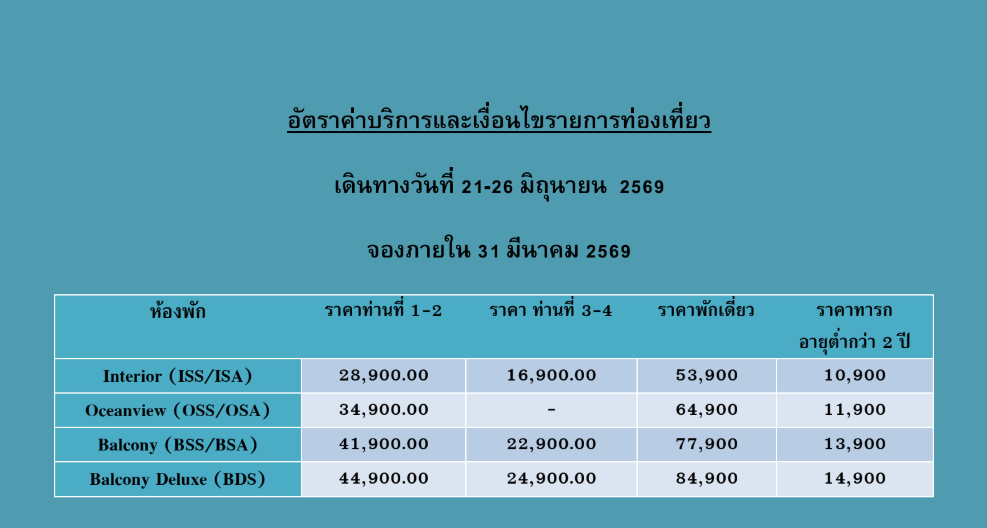 วันที่เดินทาง 21 - 26 มิ.ย. 69