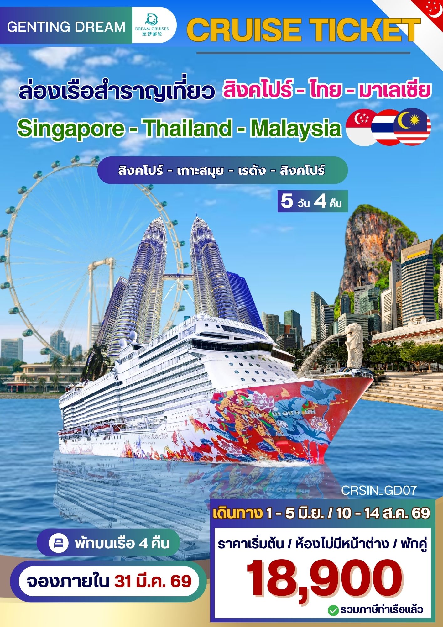 เปิดประสบการณ์ใหม่…พักผ่อนสบายๆ 4 คืนสุดพิเศษกับเรือสำราญ Genting Dream ออกเดินทางจากสิงคโปร์ ล่องข้ามทะเลสู่ประเทศไทย ต่อด้วย มาเลเซีย เที่ยวเกาะสมุย และ เรดัง พร้อมทำกิจกรรม ความบันเทิงต่าง บนเรือมากมาย