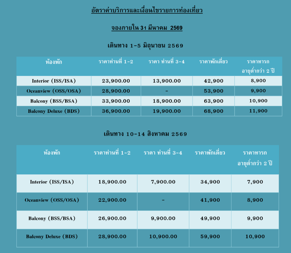 วันที่เดินทาง 1 - 5 มิ.ย. 69 / 10 - 14 ส.ค. 69