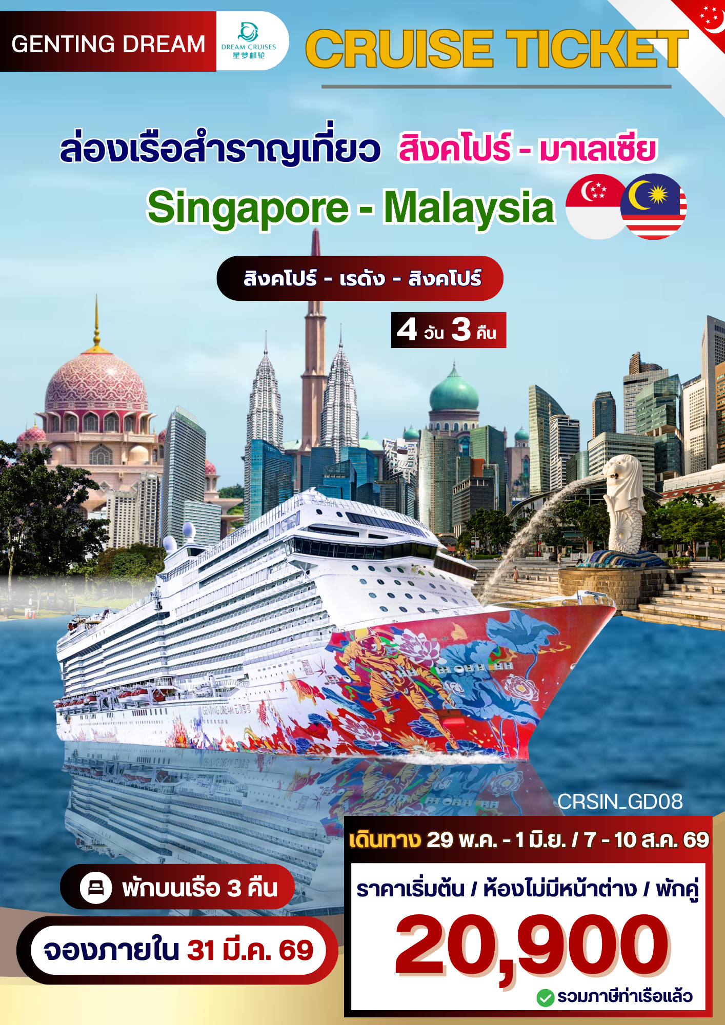 เปิดประสบการณ์ใหม่…พักผ่อนสบายๆ 3 คืนสุดพิเศษกับเรือสำราญ Genting Dream ออกเดินทางจากสิงคโปร์ ล่องข้ามทะเลสู่ประเทศมาเลเซีย เที่ยวเรดัง พร้อมทำกิจกรรม ความบันเทิงต่างๆ บนเรือมากมาย