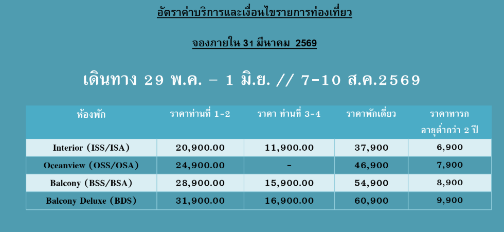 วันที่เดินทาง 29 พ.ค. - 1 มิ.ย. 69 / 7 - 10 ส.ค. 6