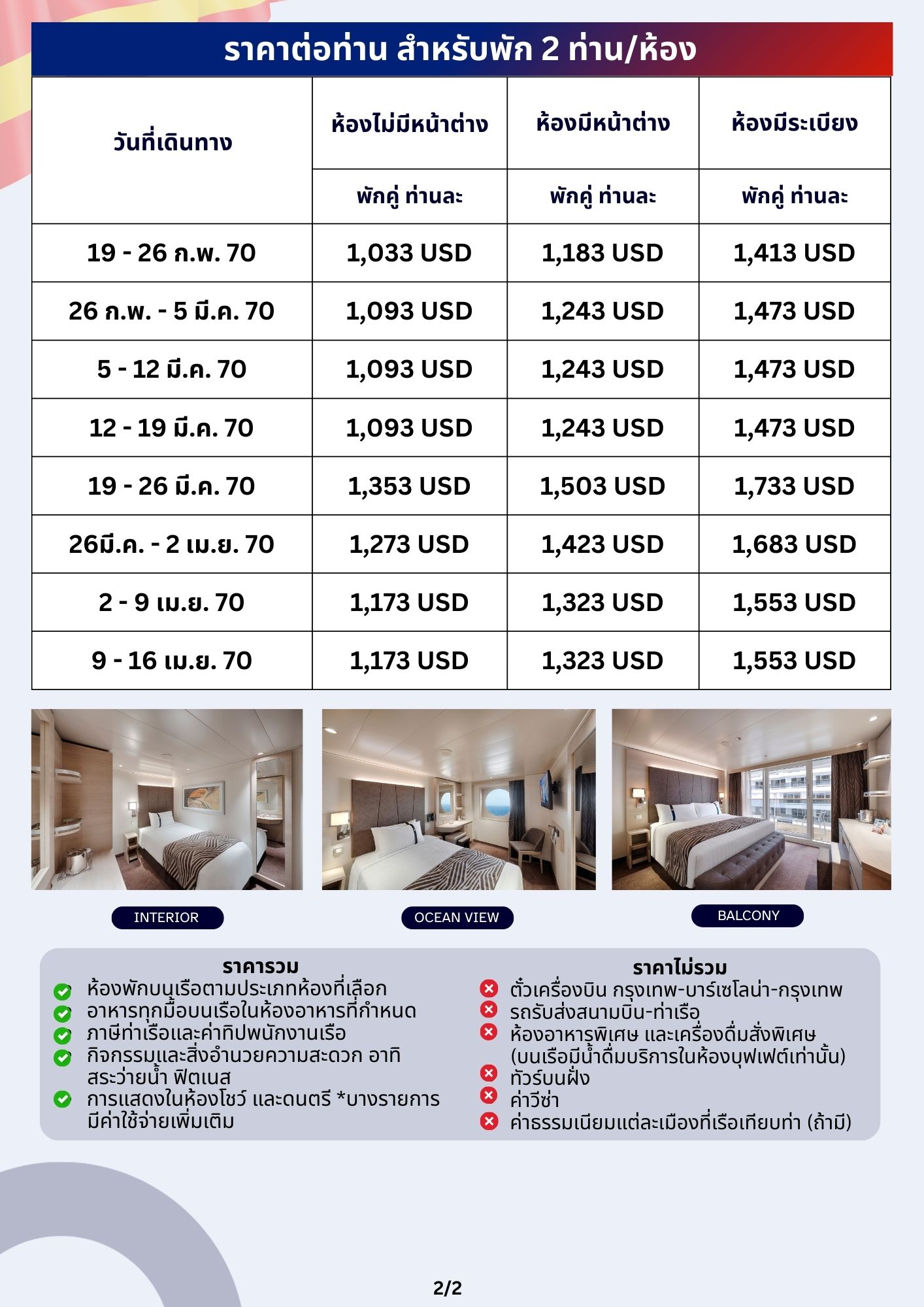 - ห้องพักบนเรือตามประเภทห้องที่เลือก