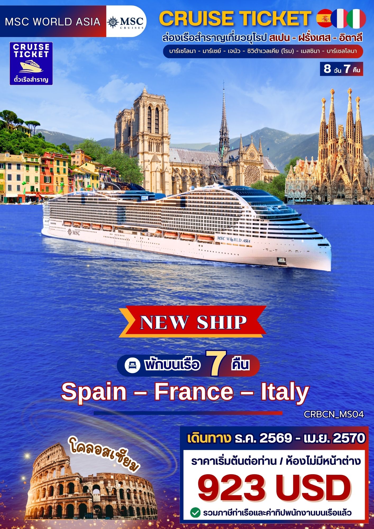 วันที่เดินทาง ธ.ค. 2569 - เม.ย. 2570 กับเรือ MSC WORLD ASIA เป็นเรือสำราญสุดหรูระดับโลก เส้นทางบาร์เซโลนา - มาร์เซย์ - เจนัว - ซิวิต้าเวลเคีย (โรม) - เมสซินา - บาร์เซลโลนา
