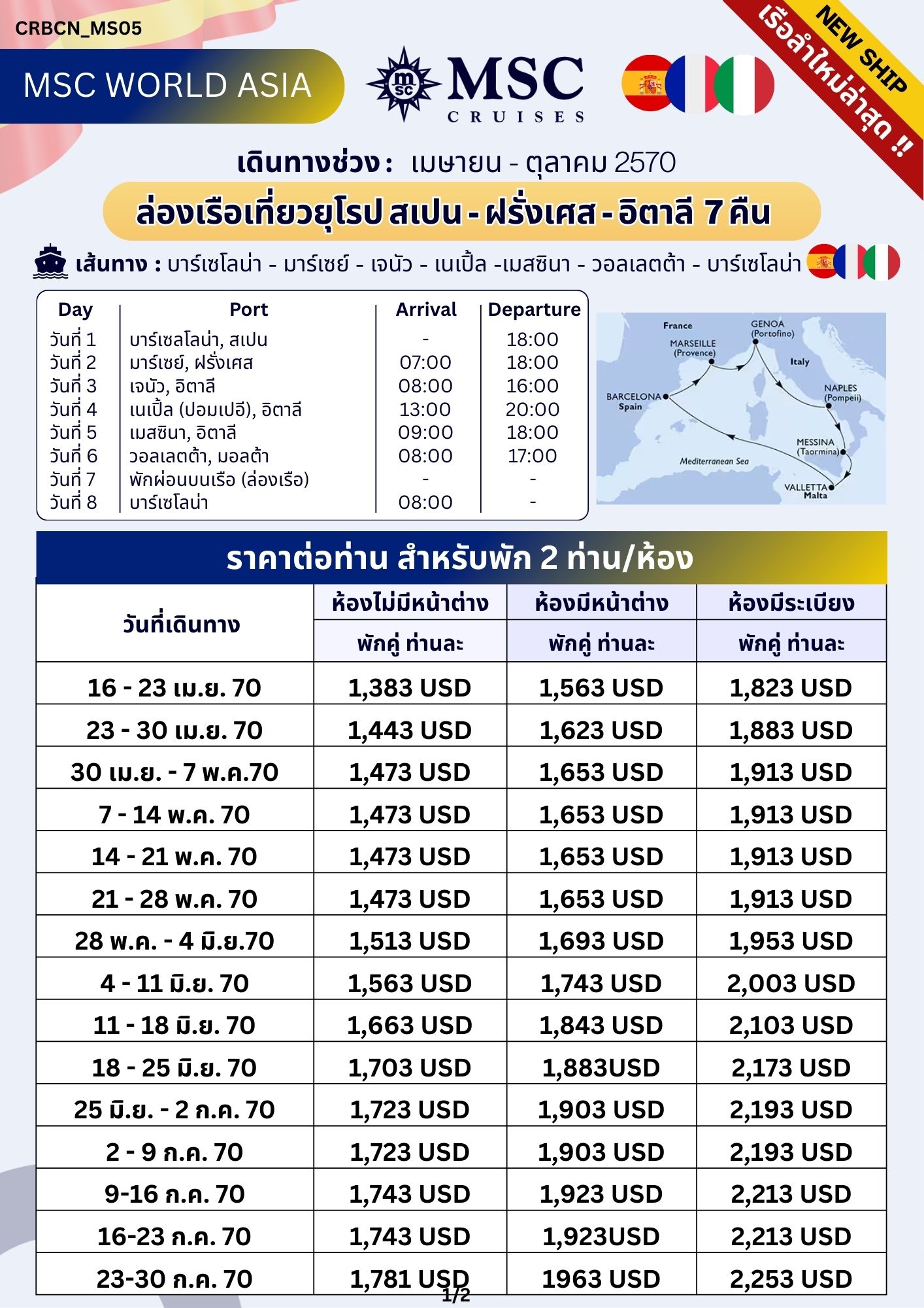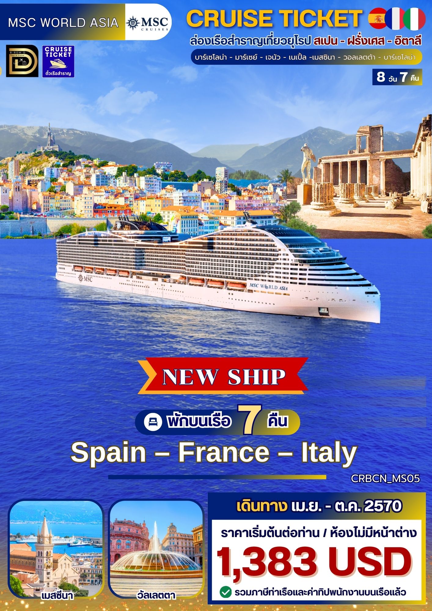 วันที่เดินทาง เม.ย. - ต.ค. 2570 กับเรือ MSC WORLD ASIA เป็นเรือสำราญสุดหรูระดับโลก เส้นทางบาร์เซโลน่า - มาร์เซย์ - เจนัว - เนเปิ้ล -เมสซินา - วอลเลตต้า - บาร์เซโลน่า