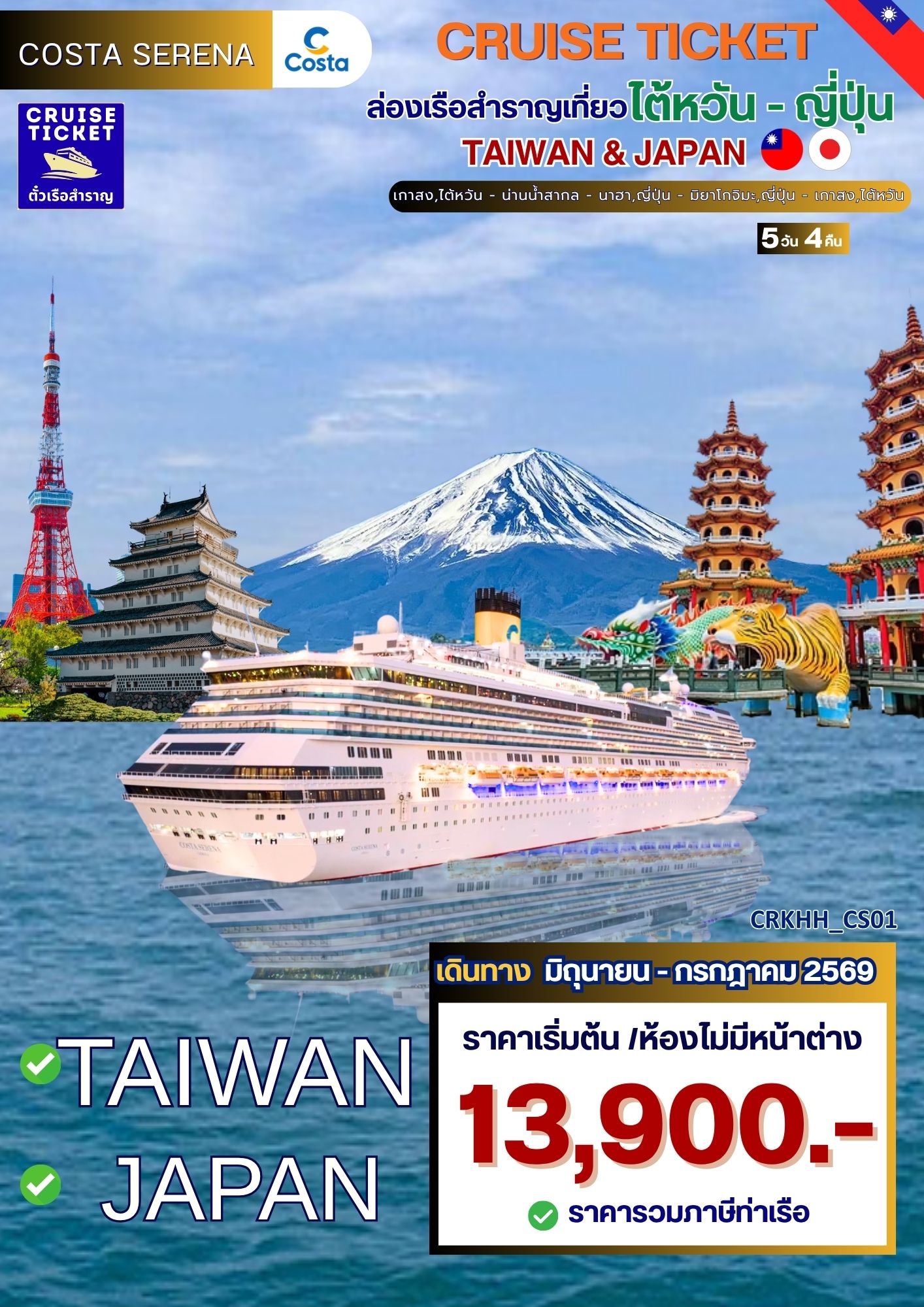 ล่องเรือ Costa Serena เส้นทาง เกาสง - น่านน้ำสากล - นาฮา - มิยาโกจิมะ - เกาสง พักบนเรือ 4 คืน เดินทาง 28 มิถุนายน - 1 กรกฎาคม / 1-6, 6-10 กรกฎคม 2569